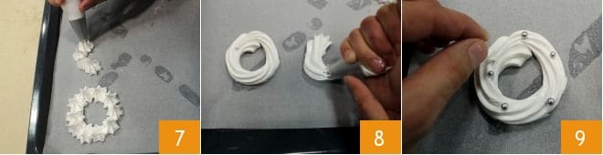 À ce stade, vous pouvez réaliser vos couronnes en 2 variantes : sur une plaque beurrée et recouverte de papier sulfurisé, faites des petits tas de meringue l'un à côté de l'autre formant un cercle 7. Continuez avec les suivants en faisant un mouvement circulaire afin d'obtenir un autre type de décoration 8 ; enfin, répartissez sur les couronnes que vous avez obtenues les perles de sucre argentées 9. Une fois terminé, laissez sécher les meringues dans un four ventilé à 100° pendant au moins 3 heures, en maintenant la porte entrouverte.