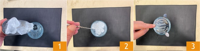 Pour préparer le Gin Tonic, il suffit de verser dans le verre haut la glace 1 et de mélanger avec la cuillère à bar 2. Puis, avec le strainer, vous pouvez éliminer l'excès d'eau 3.
