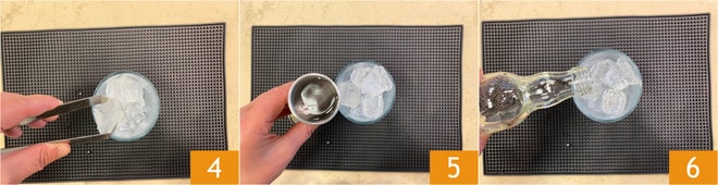 Si nécessaire, complétez avec 1 ou 2 glaçons supplémentaires 4, avant de verser les 4,5 cl de gin 5 et 10 cl de tonic 6, jusqu'à remplir le verre.