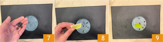 Mélangez avec la cuillère à bar, puis ajoutez dans le verre des baies de genièvre 7 et une tranche de lime 8. Prêt à servir un parfait Gin Tonic 9 !