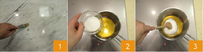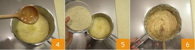 Pour la giuggiulena, préparez dès maintenant tout ce dont vous avez besoin car il est indispensable de travailler très rapidement après la cuisson. Commencez donc par huiler un plan de travail en marbre, ou alternativement, une feuille de papier sulfurisé posée sur une surface résistante à la chaleur 1. Ensuite, remplissez un récipient d'eau froide et gardez à proximité une spatule en métal ou une lame lisse suffisamment longue. À ce stade, vous pouvez passer à la préparation. Dans une petite casserole en acier (ou en cuivre), faites chauffer à feu moyen le miel avec le sucre 2 et remuez jusqu'à ce que le tout soit fondu 3.