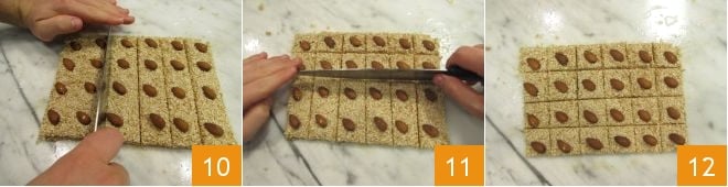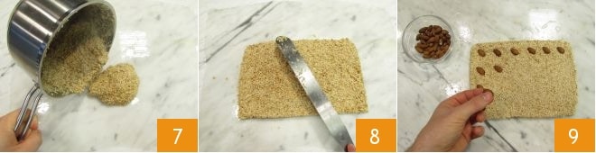 Dès que la pâte est bien mélangée, dorée et plus compacte, éteignez le feu et transférez-la immédiatement sur le plan huilé 7. Faites attention à ne pas vous brûler, aidez-vous avec la spatule mouillée pour lisser jusqu'à obtenir une plaque rectangulaire d'environ 1 cm d'épaisseur et égalisez soigneusement les côtés 8. À ce moment-là, imaginez diviser la plaque en 24 carrés de 3x3 cm. Au centre de chacun, placez une amande 9.
