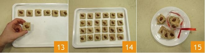 Pour finir, transférez les petits carrés sur une feuille de papier sulfurisé huilée 13 et laissez reposer toute la nuit à température ambiante 14. Le lendemain, votre giuggiulena sera prête à être dégustée ou offerte dans des petits sachets alimentaires 15.