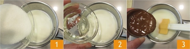 Pour préparer la glace à la noisette, versez le lait dans une casserole avec le sucre 1 et le glucose 2 et mélangez à feu doux. Ajoutez la pâte de noisettes 3.