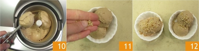 Vous devrez obtenir une consistance crémeuse 10. Transférez la glace dans un plat et mettez-la au congélateur pendant environ 2 heures. À ce stade, vous pouvez garnir votre glace à la noisette avec du praliné de noisettes 11 et la déguster 12 !