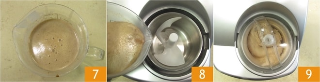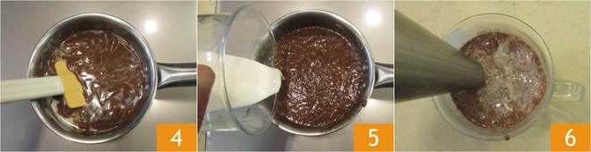 Continuez à mélanger pour tout dissoudre 4, puis éteignez le feu et ajoutez la crème 5. Transférez le tout dans un pichet et mixez avec un mixeur plongeant 6.