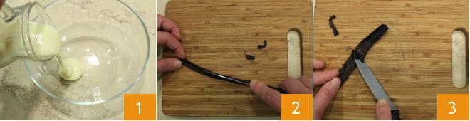 Pour réaliser la glace à la vanille avec noix croquantes, commencez par placer dans un grand bol le lait concentré 1, puis prenez la gousse de vanille, incisez-la avec un couteau tranchant dans le sens de la longueur 2, extrayez les graines 3