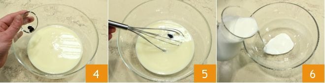 et ajoutez-les au lait concentré 4, mélangez avec un fouet 5 et mettez de côté. Dans un autre bol, versez la crème fraîche liquide 6