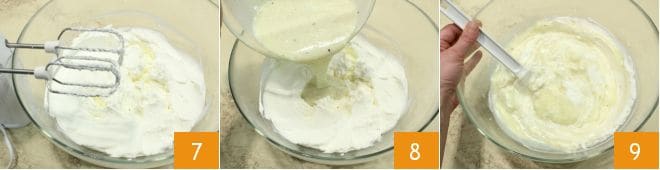et montez-la en chantilly bien ferme 7, incorporez à la crème le lait concentré aromatisé à la vanille 8 et mélangez délicatement avec une spatule pour ne pas faire retomber la crème 9 jusqu'à obtenir un mélange homogène.