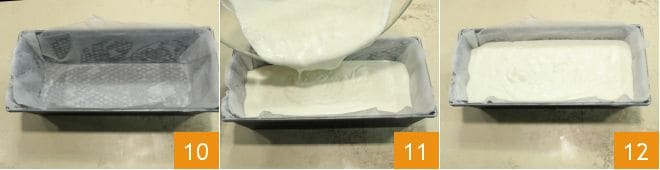 Beurrez un moule ou un plat à bord haut, celui du cake est parfait pour cette préparation, tapissez les bords et le fond avec du papier sulfurisé 10 et versez à l'intérieur la glace à la vanille 11. Placez le mélange au congélateur pour qu'il durcisse pendant 6-8 heures 12.