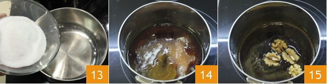 Une fois le temps écoulé, votre glace sera prête, passez à la garniture avec les noix. Placez une casserole sur le feu, versez-y le sucre en poudre 13 et faites fondre à feu doux le sucre jusqu'à ce qu'il devienne sombre 14 et liquide. À ce stade, éteignez le feu et plongez les noix quelques instants pour les enrober de caramel 15,
