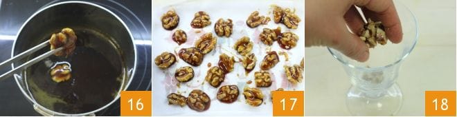 sortez les noix à l'aide d'une pince de cuisine 16 et placez-les sur un plateau recouvert de papier sulfurisé 17. À ce stade, vous pouvez composer vos coupes de glace : prenez une coupe en verre pour glace et mettez une première couche de noix caramélisées 18,