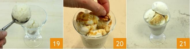 puis ajoutez une boule de glace 19 et continuez par couches en alternant la glace avec les noix et le caramel 20. Votre glace à la vanille avec noix croquantes est prête à être dégustée! 21.