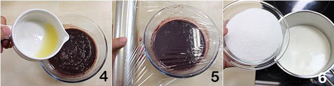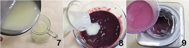 et ajoutez le jus obtenu à la pulpe de raisin 4, puis mélangez bien avec une cuillère, couvrez de film plastique 5 et mettez le tout au congélateur pour refroidir (il doit devenir bien froid mais pas dur). Pendant ce temps, faites chauffer la crème et le sucre dans une casserole, à feu doux, jusqu'à ce que le sucre soit complètement dissous 6 et ait atteint une température de 83° (vous pouvez la vérifier avec un thermomètre alimentaire).