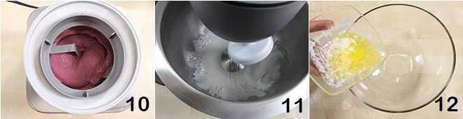 Lorsque le mélange a atteint la température indiquée, refroidissez-le rapidement dans un refroidisseur rapide ou transférez-le dans une carafe 7 et placez-la dans un saladier plein de glace pour le refroidir rapidement, puis couvrez de film plastique et mettez la carafe au congélateur : le mélange doit devenir bien froid. Lorsque le raisin et le mélange avec la crème sont suffisamment froids, mélangez-les ensemble à l'aide d'un fouet 8, puis transférez le tout dans une sorbetière 9 (le bol de la sorbetière doit être bien froid, nous conseillons de le mettre au congélateur au moins la veille).