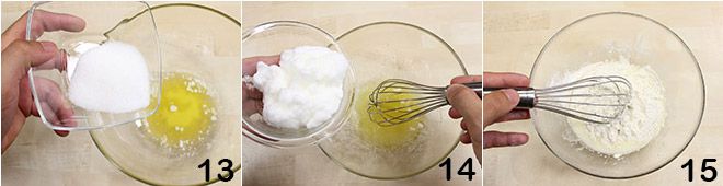 Ajoutez au beurre le sucre 13 et mélangez avec un fouet pour amalgamer les ingrédients, vous devez obtenir un mélange homogène et sans grumeaux). Continuez à mélanger, incorporez le blanc en neige 14 et la farine tamisée 15 : vous devez obtenir un mélange homogène et sans grumeaux.