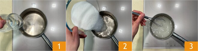 Pour préparer la glace au tiramisù, commencez par le sirop : dans une petite casserole, chauffez l'eau 1 et ajoutez petit à petit le sucre 2, en mélangeant avec le fouet 3.