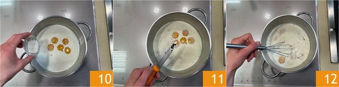 Complétez avec la farine de caroube 10 et les graines de la gousse de vanille 11. Tout doit être ajouté à froid dans la casserole. Maintenant, allumez le feu moyen et mélangez 12 avec le fouet.