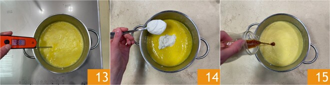 Portez le mélange à 85°, en continuant de mélanger 13. Retirez du feu, attendez d'atteindre 65°, toujours en mélangeant. À ce stade, vous pouvez ajouter le mascarpone petit à petit 14. Versez le café préparé avec la cafetière moka 15.