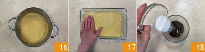 Mélangez pour amalgamer 16, puis transférez le mélange dans un plat, couvrez avec un film plastique 17 et laissez reposer deux heures au réfrigérateur. Préparez ensuite le trempage : faites le café avec la cafetière moka, sucrez-le encore chaud 18.
