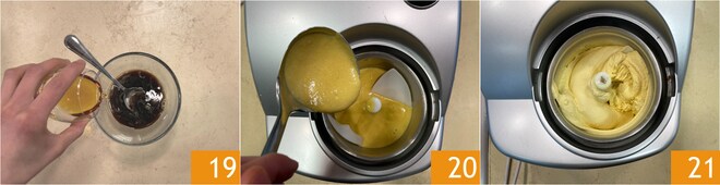 Aromatisez avec la liqueur d'amaretto 19. Laissez refroidir. Sortez le mélange de tiramisù du réfrigérateur et versez-le dans la sorbetière 20, mettez la machine en marche et laissez-la fonctionner pendant le temps recommandé, avec notre sorbetière il faut 30 minutes pour le turbinage 21. Transférez la glace prête dans une poche à douille.