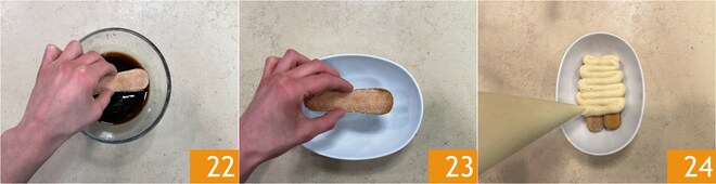 Composez le dessert : trempez les boudoirs dans le trempage au café d'un seul côté 22, puis placez un boudoir sur une assiette de service 23, répartissez la glace dessus 24.