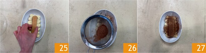 Continuez avec un autre boudoir imbibé dans le trempage 25, puis saupoudrez de cacao amer 26 et de poudre de café. La glace au tiramisù est prête à être dégustée 27.