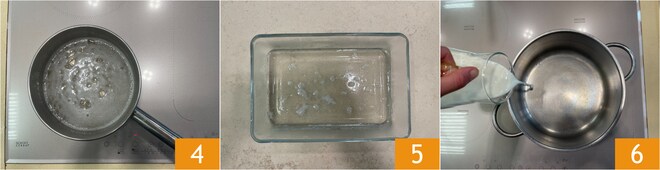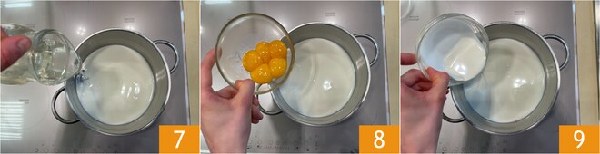 Quand des bulles commencent à se former 4, transférez-le dans un plat et laissez refroidir 5. Versez le lait dans une casserole 6.