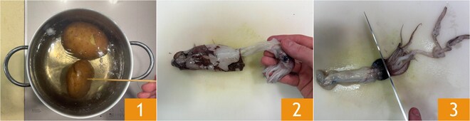 Pour préparer les gnocchetti à l'encre de seiche avec ragoût de seiches, commencez par cuire les pommes de terre dans de l'eau bouillante salée, cela prendra environ 30-40 minutes 1. Testez avec une brochette pour vérifier la cuisson, puis égouttez-les et laissez-les refroidir complètement. Pendant ce temps, nettoyez les seiches. Retirez la tête et les entrailles 2, puis enlevez le bec, situé au centre des tentacules. Séparez le corps des tentacules et réservez ces derniers 3.