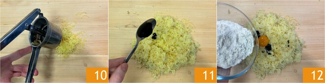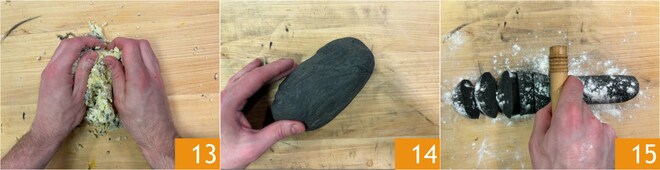 En attendant, sur un plan de travail, écrasez les pommes de terre 10, ajoutez l'encre de seiche 11, un jaune d'œuf et la farine 12.