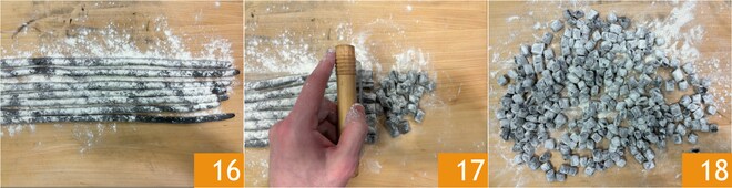 Avec chacune de ces portions, formez des boudins d'environ 2 cm d'épaisseur 16. Farinez-les bien pour qu'ils ne collent pas entre eux, puis coupez-les en morceaux avec un coupe-pâte 17 pour former les gnocchetti 18.
