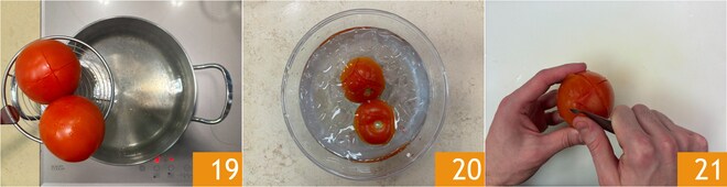 Après avoir lavé les tomates, faites une incision en croix au fond et blanchissez-les pendant 2 minutes 19. Plongez-les ensuite dans de l'eau glacée pendant 2 minutes supplémentaires 20 et retirez la peau 21, qui se détachera facilement.
