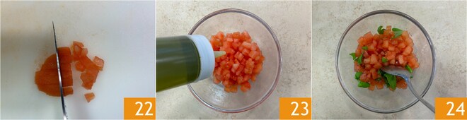 Coupez les tomates en deux, retirez les graines, puis réduisez-les en dés 22. Assaisonnez avec de l'huile 23, du sel, du poivre et du basilic frais. Mélangez bien 24.