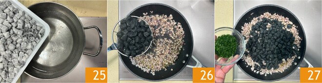 Plongez les gnocchetti dans de l'eau bouillante salée 25 et faites-les cuire jusqu'à ce qu'ils remontent à la surface. Retirez l'ail du ragoût de seiches, puis égouttez les gnocchetti et transférez-les dans la poêle 26, ajoutez le persil frais haché 27 et mélangez, à feu éteint, pour bien les enrober de saveur.