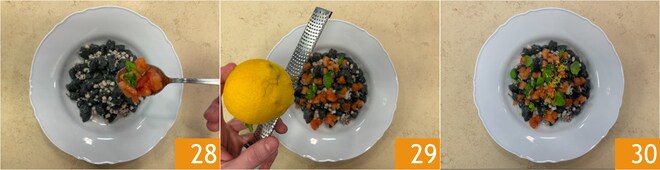 Dressez les gnocchetti et complétez avec les dés de tomates 28, une cuillère de jus de cuisson des seiches, des feuilles de basilic et du zeste de citron râpé 29. Les gnocchetti à l'encre de seiche avec ragoût de seiches sont prêts à être servis 30 !
