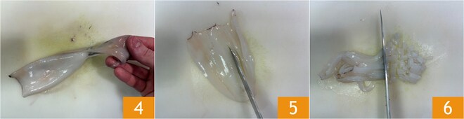 Retirez la peau 4 et coupez le corps et les tentacules en petits dés 5 6.