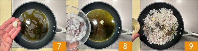 Dans une poêle, versez un filet d'huile et ajoutez l'ail écrasé 7, puis faites revenir quelques minutes. Ajoutez les seiches coupées 8 et faites cuire 5 minutes à feu moyen. Déglacez avec du vin blanc 9 et faites cuire 20 minutes, en ajoutant un peu d'eau si nécessaire.
