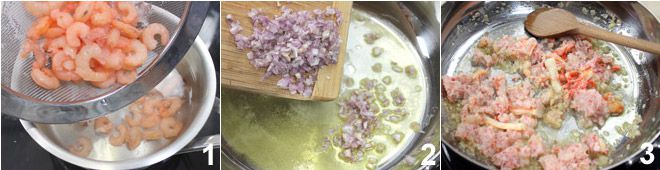 Pour préparer les gnocchetti avec chair de crabe et crevettes, commencez par nettoyer et cuire les crevettes dans de l'eau salée 1. Hachez ensuite l'échalote et faites-la dorer avec l'huile et une noix de beurre 2, ajoutez ensuite la chair de crabe 3