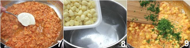 Une fois que la sauce a épaissi, ajoutez une cuillère à soupe généreuse de Philadelphia classique 7 et mélangez le tout. Faites cuire les gnocchi dans une grande quantité d'eau salée 8, égouttez-les et faites-les sauter à la poêle avec la sauce. Ajoutez enfin une poignée de persil haché 9 et servez les gnocchetti immédiatement !