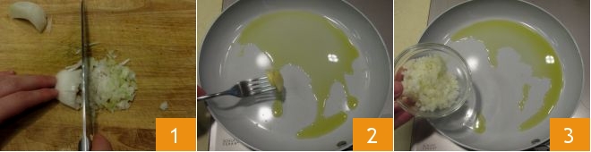 Pour préparer les gnocchetti sardi à la paysanne, commencez par mettre une casserole d'eau salée sur le feu. Pendant ce temps, épluchez et hachez finement l'oignon 1. Arrosez d'un filet d'huile une poêle large, faites revenir une gousse d'ail entière à feu doux 2, puis retirez-la une fois dorée et ajoutez le hachis d'oignon dans la poêle 3. Remuez de temps en temps pour éviter qu'ils ne brûlent.