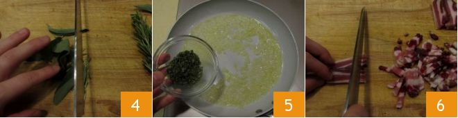 Pendant que l'oignon rissolent, hachez la sauge et le romarin (gardez quelques aiguilles entières pour décorer le plat final si vous le souhaitez) 4, faites-les revenir avec l'oignon 5. Tranchez le lard et coupez-le en lanières 6,