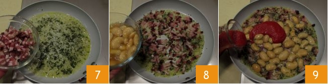 ajoutez-le au soffritto 7; puis aromatisez avec du poivre moulu. Ajoutez ensuite les haricots blancs avec leur eau de conservation 8 et enfin versez la purée de tomates 9.