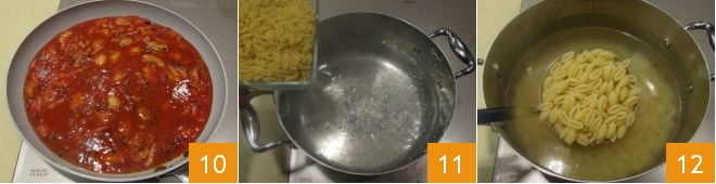 Mélangez bien les ingrédients et continuez la cuisson pendant 12 minutes, à feu vif 10. Pendant ce temps, lorsque l'eau aura atteint l'ébullition, faites cuire les gnocchetti pendant le temps indiqué sur l'emballage 11. Une fois cuits (de préférence al dente), égouttez-les à l'aide d'une écumoire 12,