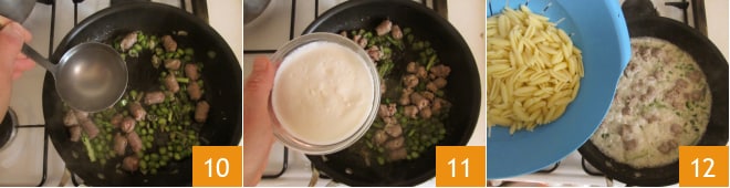Ajoutez la saucisse et faites-la revenir quelques instants 7, puis ajoutez également les asperges 8. Laissez cuire ainsi environ 5 minutes et entre-temps, mettez sur le feu une casserole pleine d'eau salée qui servira pour la cuisson des gnocchetti. Quand l'eau bout, faites cuire les pâtes al dente 9.
