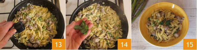 Ajoutez du poivre 13 et de la menthe fraîche 14 et servez les gnocchetti sardi avec saucisse et asperges bien chauds 15.