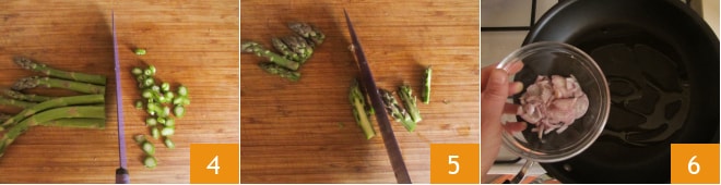 Coupez la tige en rondelles 4 et les pointes en deux 5. Dans une poêle, chauffez l'huile, ajoutez l'échalote tranchée 6 et faites-la revenir à feu modéré.