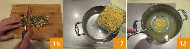 Dès qu'elles sont dorées, versez-les sur une planche à découper et émiettez-les en les coupant avec la pointe du couteau 16. Faites cuire les gnocchetti dans une grande quantité d'eau bouillante et salée 17 et dès qu'ils sont al dente, égouttez-les 18.
