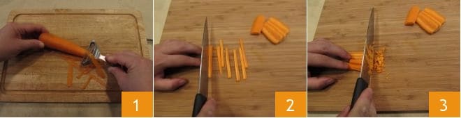 Pour préparer les gnocchetti sardi avec espadon et pistaches, commencez par nettoyer les légumes. Après avoir lavé, éliminé les deux extrémités et épluché les carottes 1, coupez-les en deux puis en bâtonnets 2 et ensuite en dés d'environ un demi-centimètre 3.
