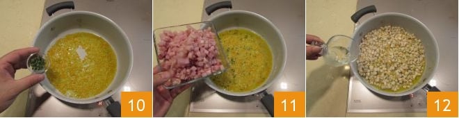 et ajoutez les feuilles de thym 10. Ajoutez les dés d'espadon 11 et laissez cuire pendant quelques minutes. Une fois que les cubes d'espadon ont changé de couleur, déglacez avec le vin blanc 12.