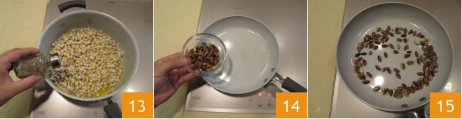 Dès que l'alcool est complètement évaporé, vous pouvez ajuster le sel et le poivre. 13 Dans une poêle, versez les pistaches 14 et faites-les griller pendant quelques minutes à feu vif en faisant très attention à ne pas les brûler, car elles deviendraient amères, donc mélangez souvent 15.